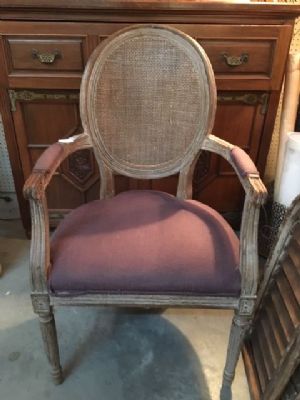 Cane back chairs with oval back and purple linen fabric. 2 available. Measures 23"X40"X19" Call store to purchase (205) 540-1868